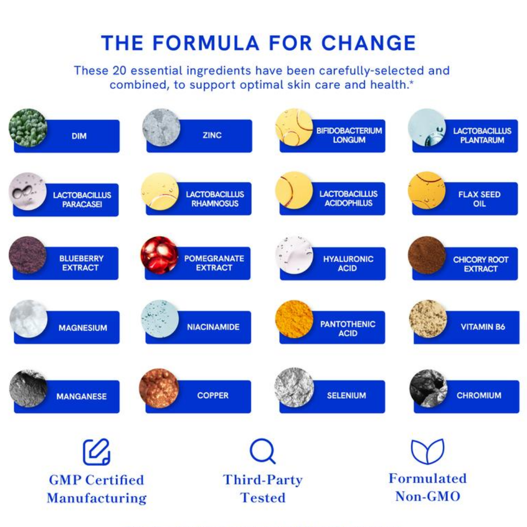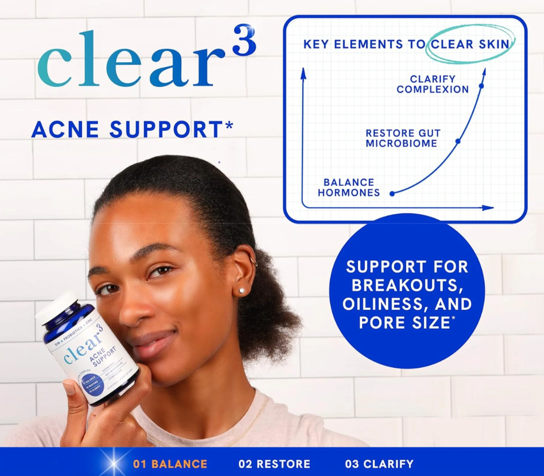 Instead of chasing quick fixes, Clear-3 supports three key areas often tied to skin clarity: hormone balance, gut support, and skin-nourishing micronutrients — in one streamlined daily formula.